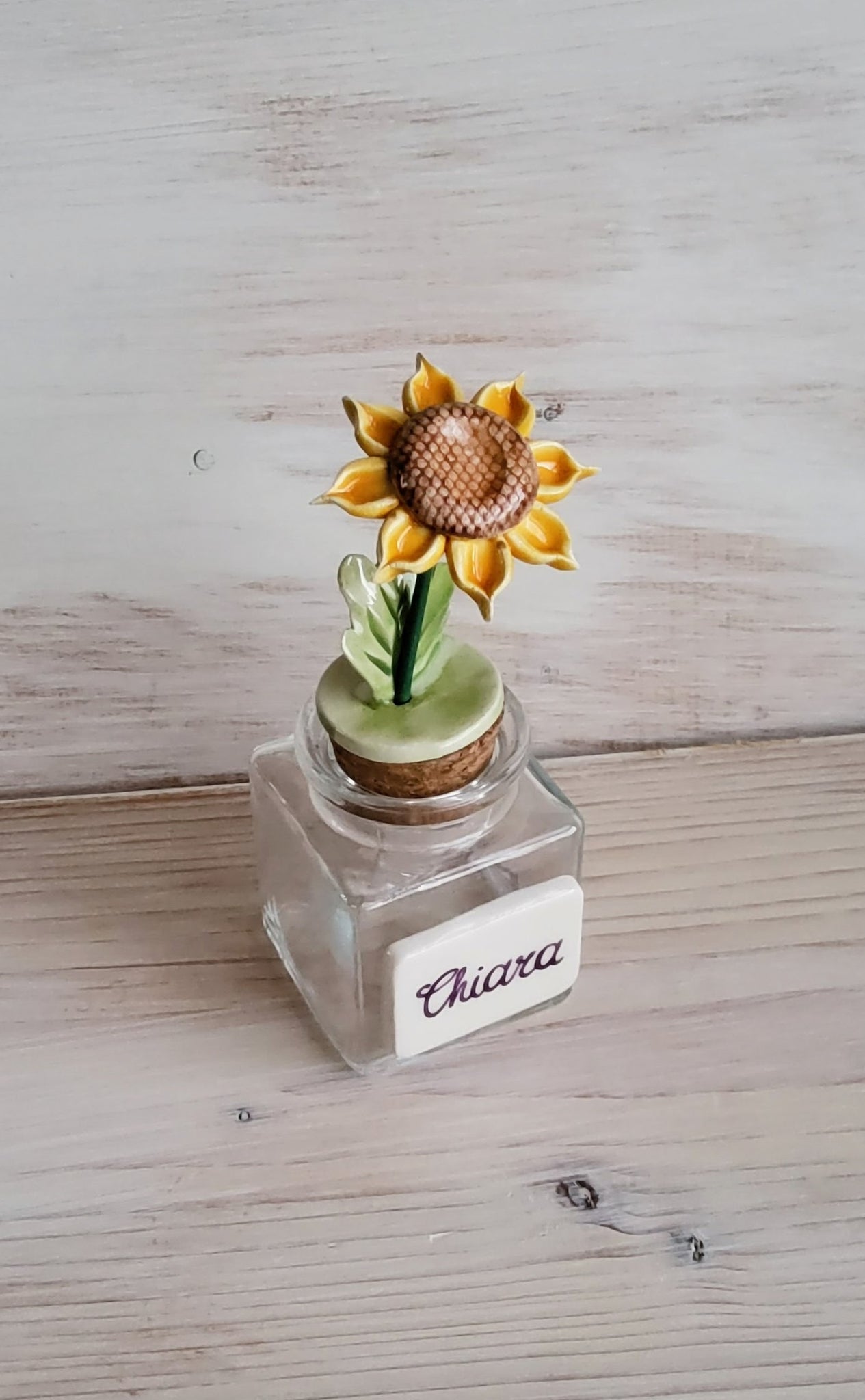 Barattolino in vetro 50 ml con girasole e targhetta in ceramica. Dimensioni intere 4 x 11 cm circa.