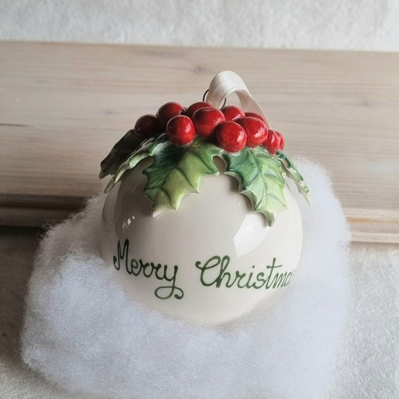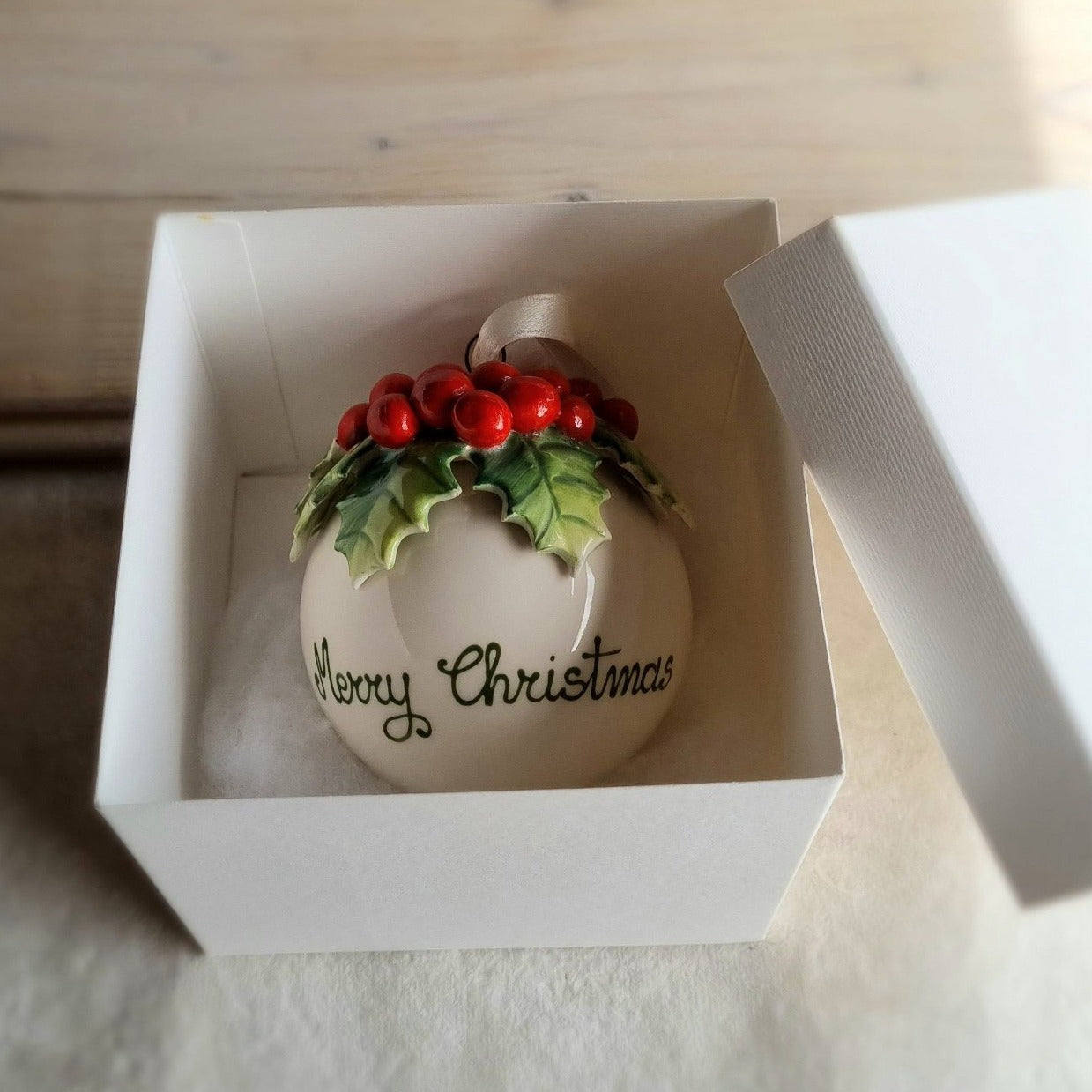 Palla di Natale con decorazione di agrifoglio, bacche rosse, nastrino abbinato e scatola inclusa.