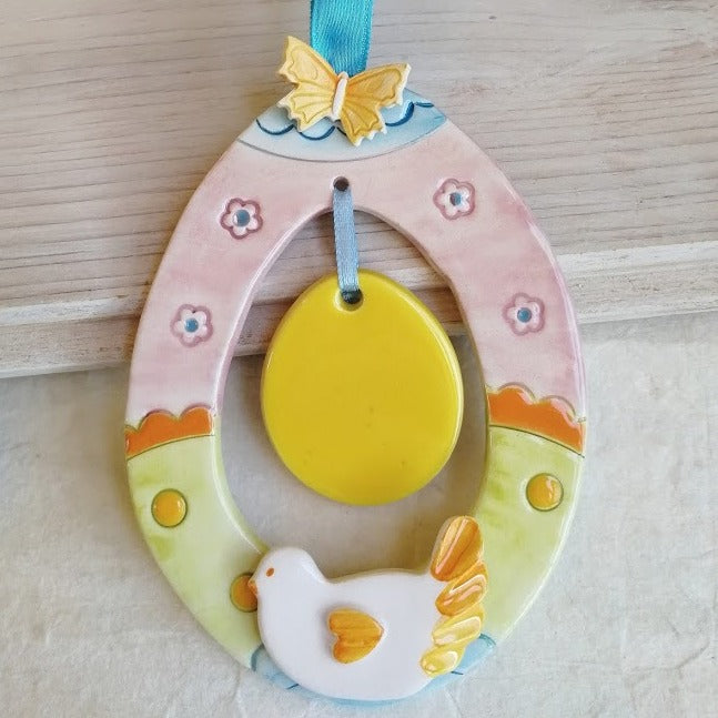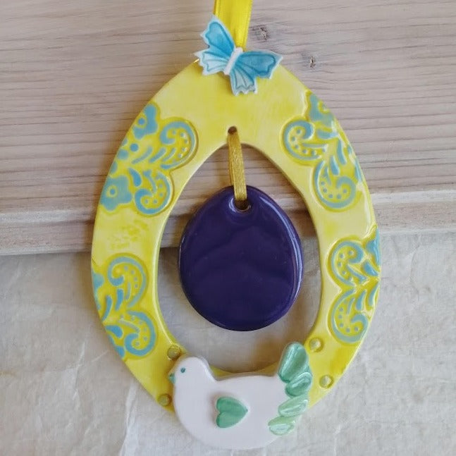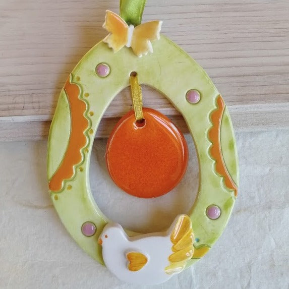Uovo di Pasqua forato con ovetto appeso, fatto interamente a mano.