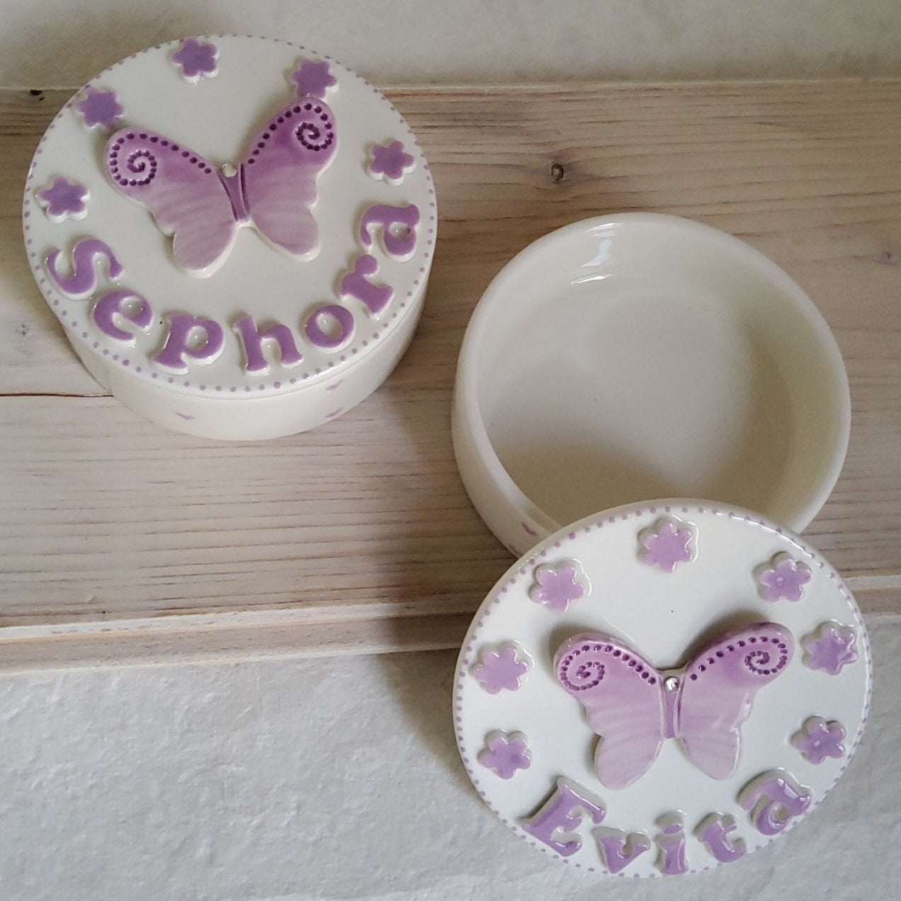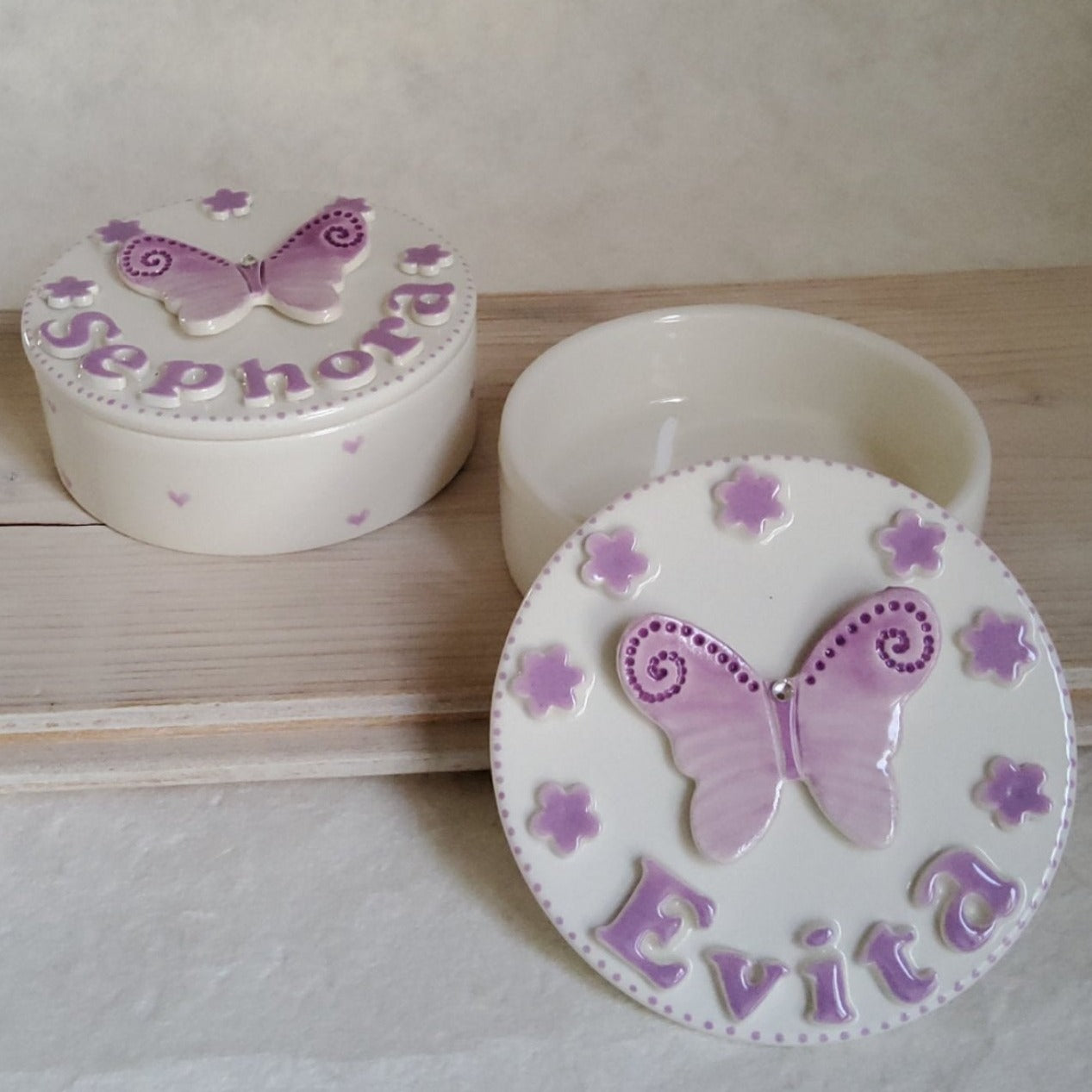 Scatola 10 x 3.5 cm con farfalla e nome a rilievo.