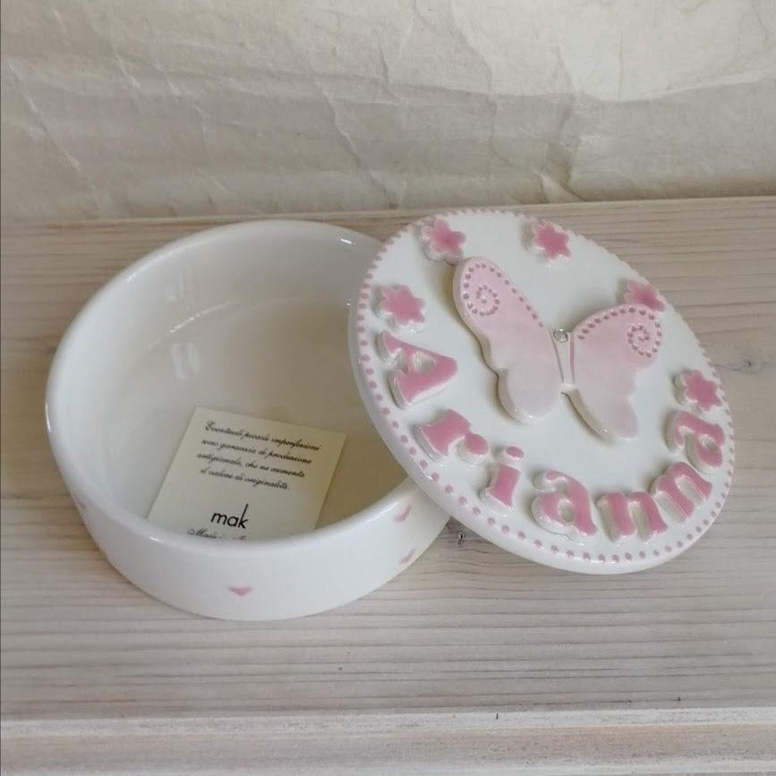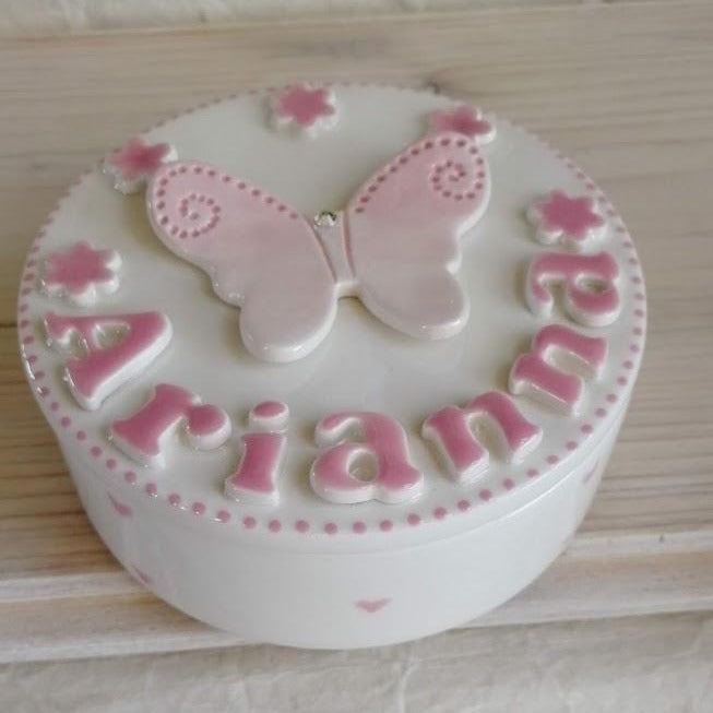 Scatola, portagioie rosa con nome a rilievo e farfalla.