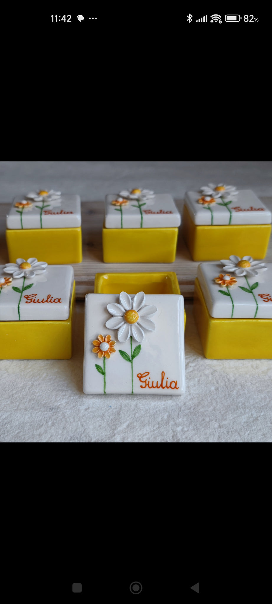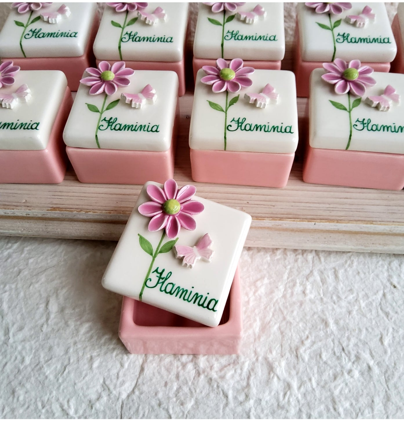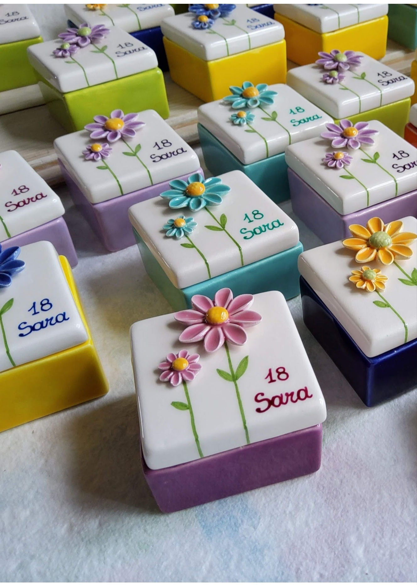 Scatolina quadrata base smaltata con fiori stilizzati.