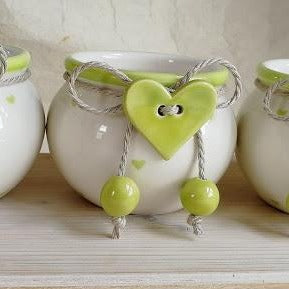 Caspo' con cuore a bottone verde/rosso. Perfetto oggetto in ceramica per le vostre cerimonie. Proposto come porta piante, porta oggetti.
